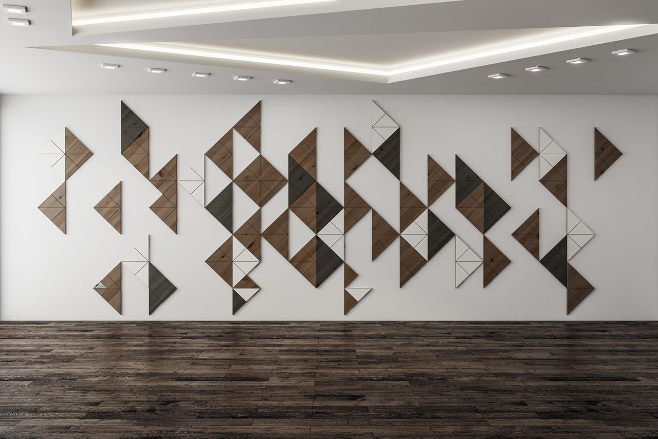 Layered triangles in soft or deep tones - think slate grey, muted terracotta, or dusty blue - work like modern murals.