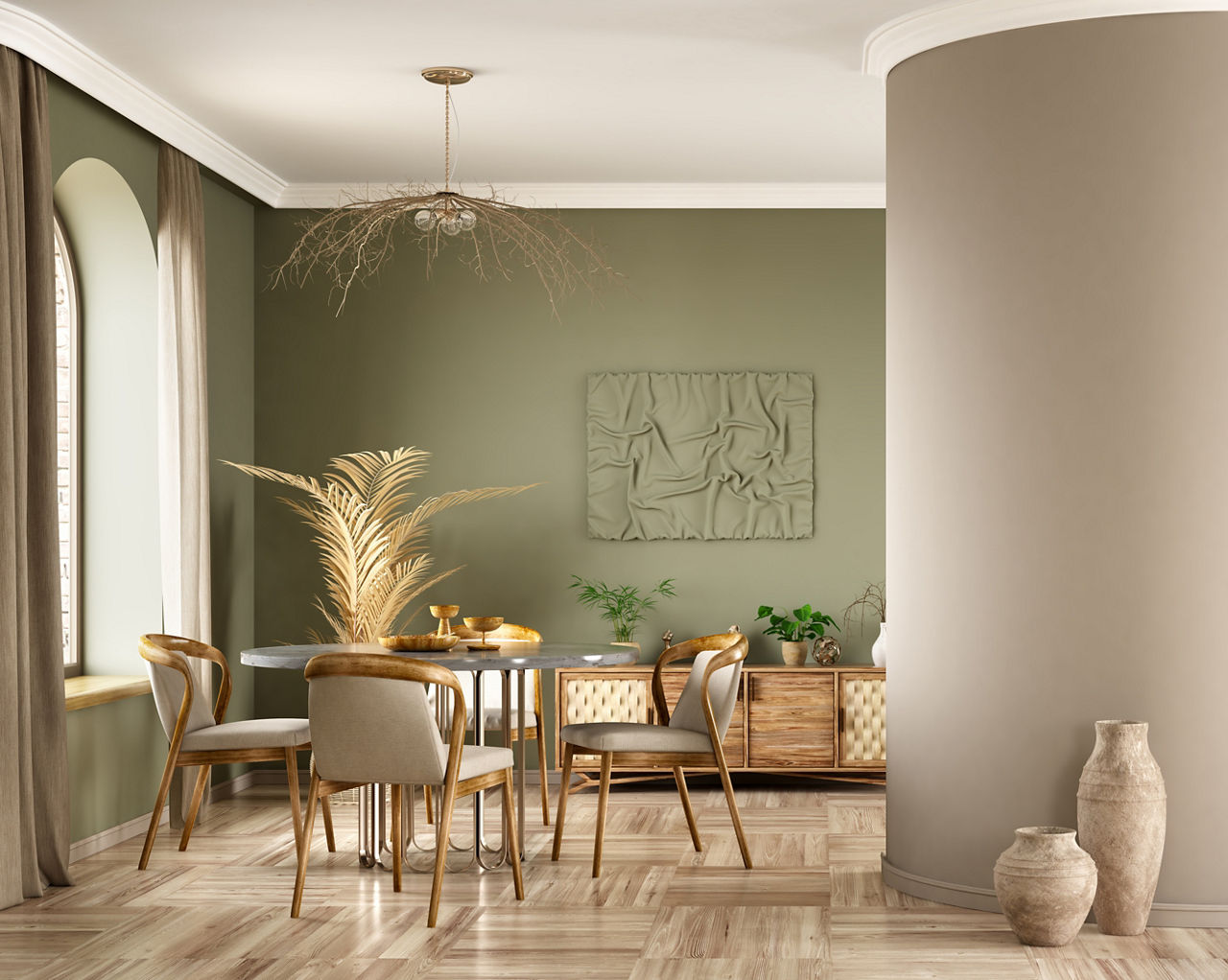 Why: The organic depth of olive green contrasts gently with off-white, creating a balanced and soothing palette.