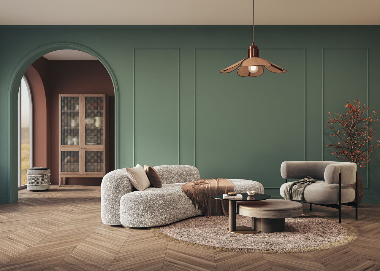 Our Recommendation: Create a nature-inspired living room with shades such as Baked Terracotta (NN 9180) and Thanks For The Trees (GG 7126).