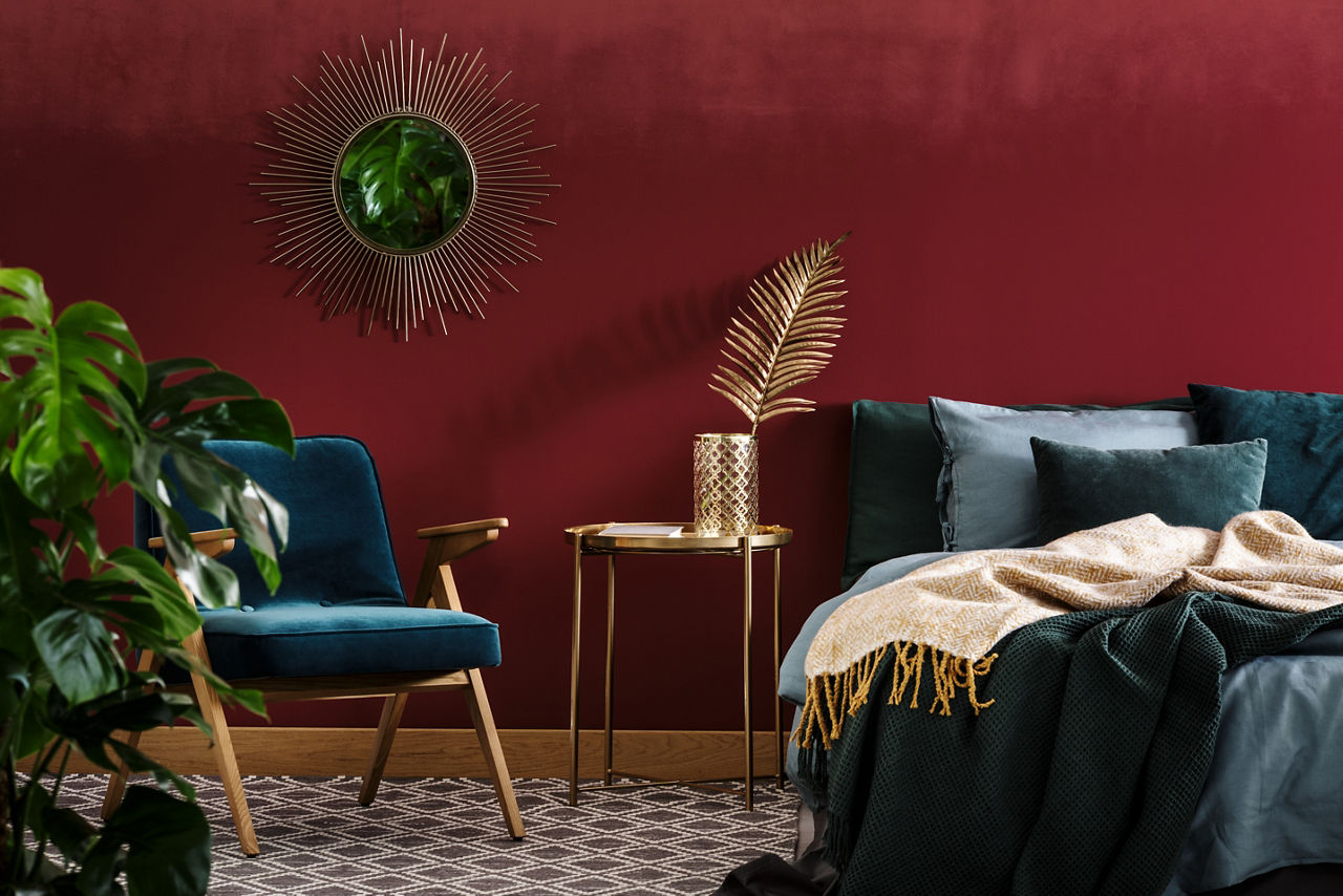 Our Recommendation: Ruby Glow (RR 3802) for wall patterns or Saffron Finch (YY 1045) for a warm, golden feature wall can instantly uplift the aura of your bedroom.