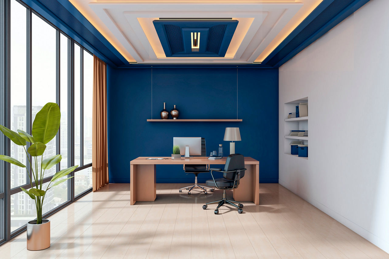 Flat or lightly layered ceilings reduce visual distraction and improve focus. Neutral colours and restrained home POP design elements help maintain an organised atmosphere.