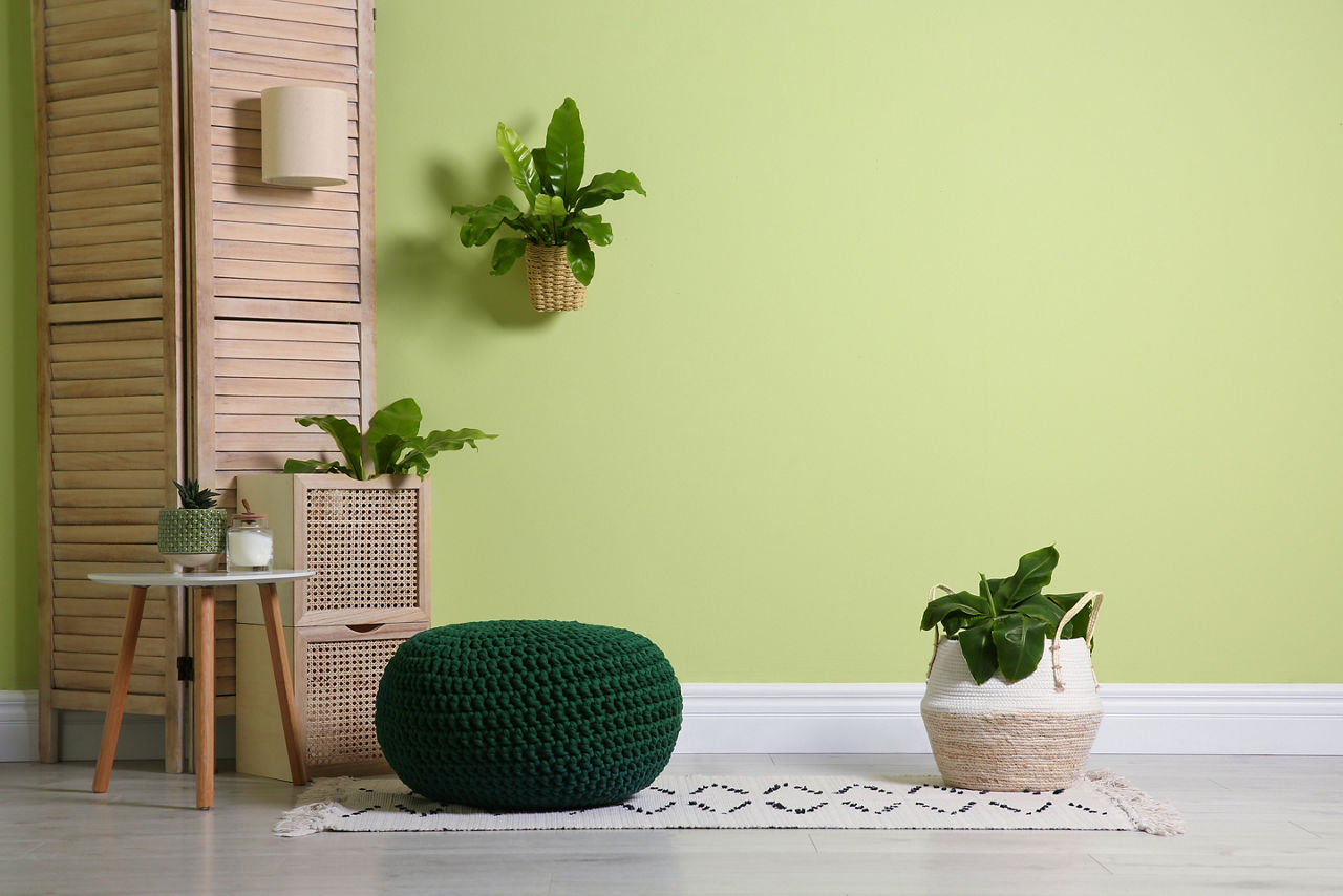 This pista green wall paint combination celebrates organic living at its best - think wooden furniture, terracotta planters, and linen textures.