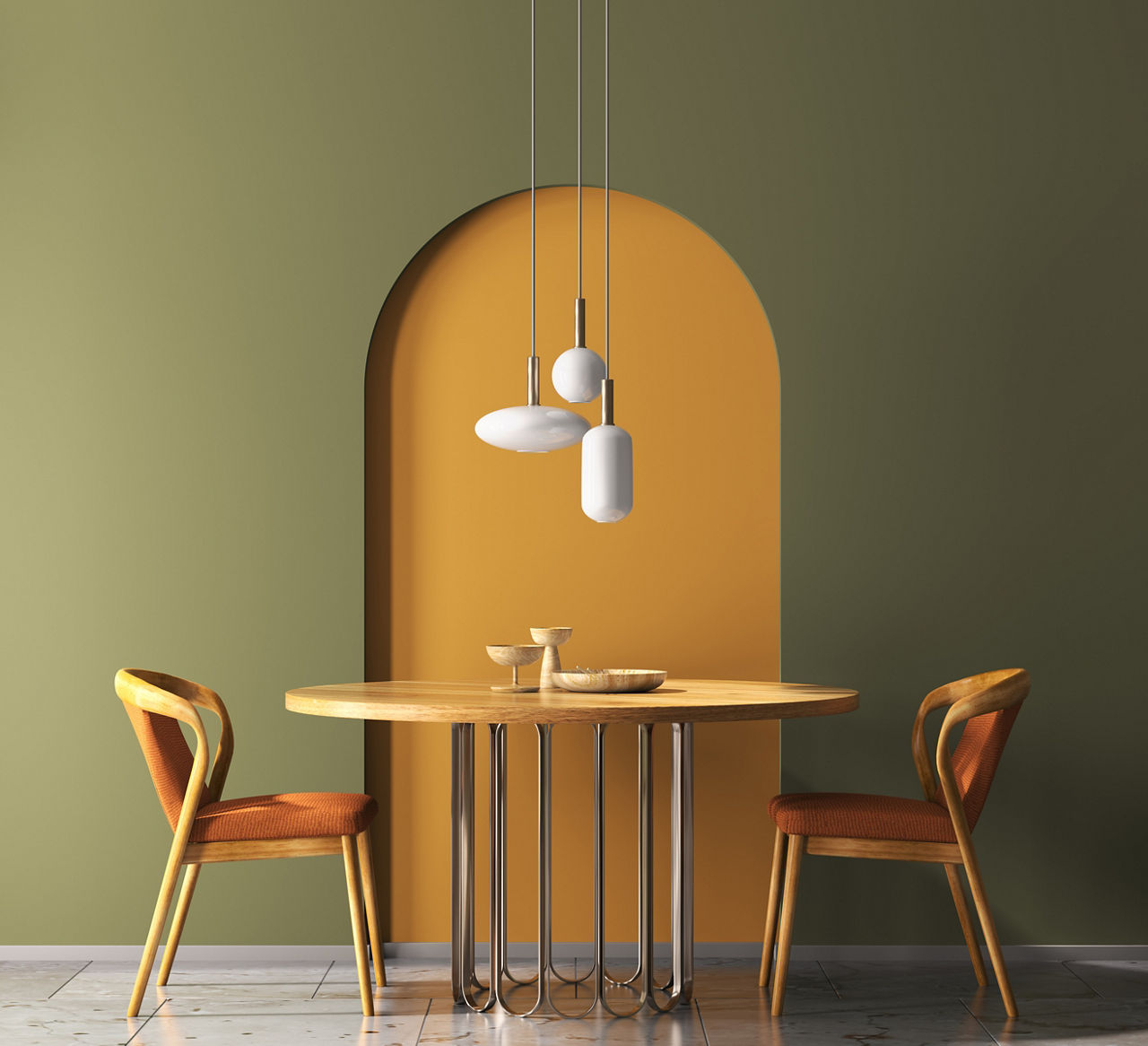 Gentle yet refreshing, pista green and peach strike a beautiful balance of coolness and warmth. This pairing works beautifully in kitchens, dining spaces, or reading nooks.