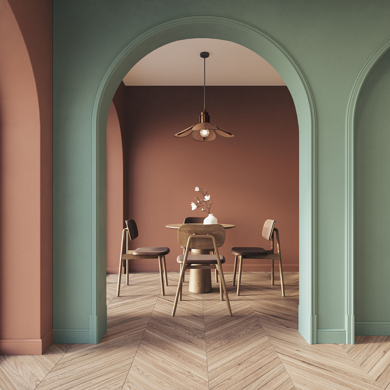 Peach softens green’s vibrancy, giving your interiors a touch of warmth and charm. For a cohesive look, complement the palette with light wooden furniture and woven textures.