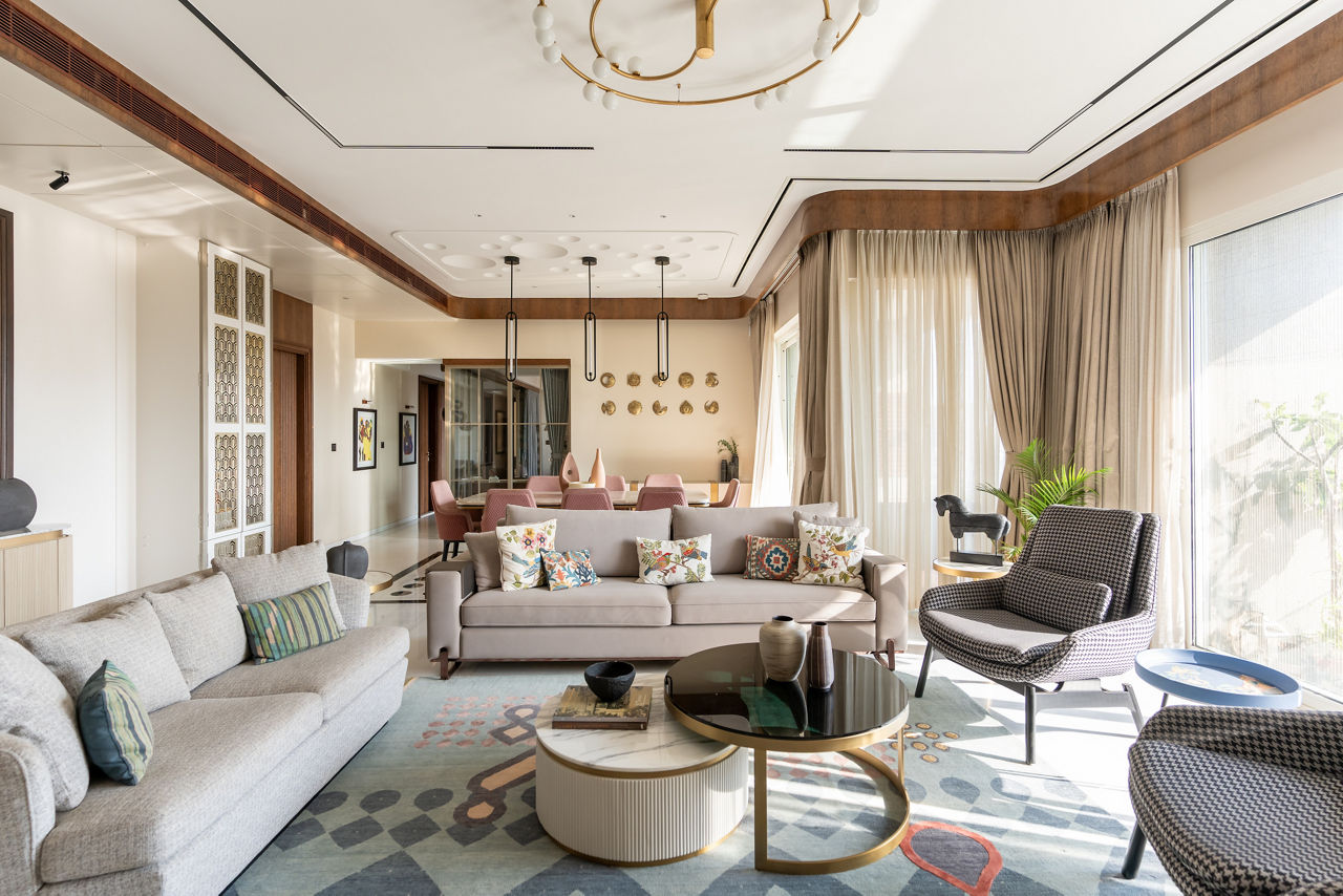 The home unfolds like a narrative, and "you'll be seeing a beautiful story which is rooted in the Indian culture, Indian traditions, and yet very modern and luxurious," says the designer. The inviting living room, for example, with its fluted wall, the "Dashavatar" art, the Pichwai partition, and the customised rug show the family's love for Indian culture while giving enough conversation-starters to the visitors. Taking the story further, the dining room floor next to the living room blends effortlessly with the contemporary blush chairs and dining table, enhancing the overall modern design aesthetics.