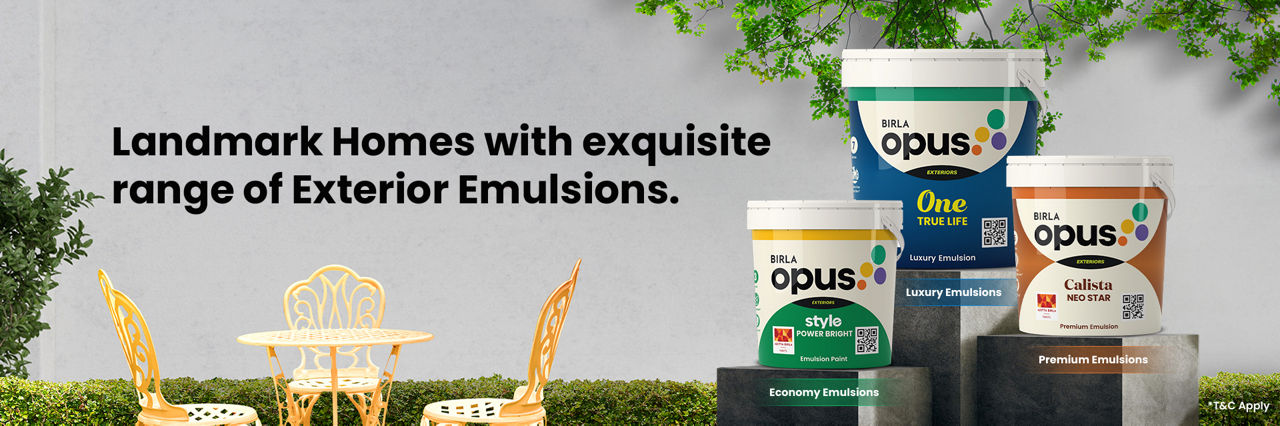 Exterior Paints by Birla Opus, specially formulated to protect your home from outdoor conditions. Available in three categories —One, Calista, and Style; each providing a range of topcoat and undercoat options for all your home renewal needs. Featuring superior quality, a wide colour palette, and various finishes, these paints are made with top-notch ingredients and technology. Birla Opus's Exterior paint collection lets you create a lasting, impressive look for your home.